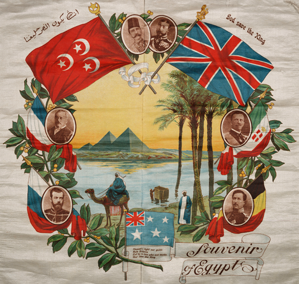 The Souvenir of Egypt, a decorative silk that is part of the Travelers in the Middle East Archive (TIMEA), makes a number of visual and cultural references. It includes seven flags, six portraits, a landscape scene, and four sections of text. In this module, we will track down the origin and significance of the texts in this souvenir. In the upper left hand corner is a phrase in foreign characters, possibly Arabic. The upper right corner includes the phrase "God Save the King," while what appears to be poem is centered at the bottom of the silk: "Heaven's light our guide/ Rule Britannia/ Evil be to him who evil thinks/ God Save the King." The final bit of text, which we take to be the name of the silk, appears in the lower right in large cursive letters: "Souvenir of Egypt." The texts seem to set up some sort of implicit relationship between "Britannia" and Egypt, but what are we to make of it? Why is "God Save the King" repeated? As we categorize, identify, and historically locate the bits of text included in the Souvenir of Egypt, we will also introduce you to a variety of research techniques and resources. We hope that you will learn as much about the process of research as you will about the object we will be examining.