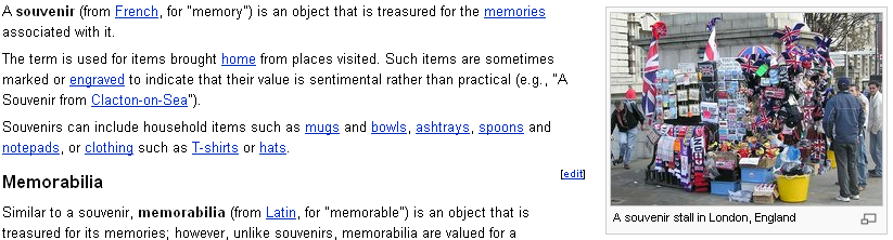 The text "Souvenir of Egypt" gives us quite a bit of information considering what we know about the remainder of the texts on the silk. We have found that most of the text expresses British imperial sentiment, and it also includes Arabic, which is spoken in Egypt, the country directly referenced by the silk's ostensible title. We know that a souvenir is a knick-knack that collected by tourists, but let's explore the significance of term further. An enyclopedia such as Encyclopedia Britannica or Wikipedia would likely provide us with some basic information on the history of tourism and souvenirs; we can turn to article- or book-length studies for a more scholarly, in-depth treatment. Let's take a look at Wikepedia's definition of "souvenir."