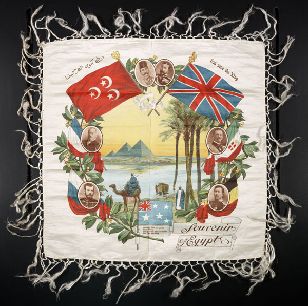 Flags are historically rich artifacts because they usually signify a specific location in space and time in which they were in use. The Souvenir of Egypt,a textile of uncertain origins that is part of the Travelers in the Middle East Archive, includes rich visual imagery, including seven unidentified flags.