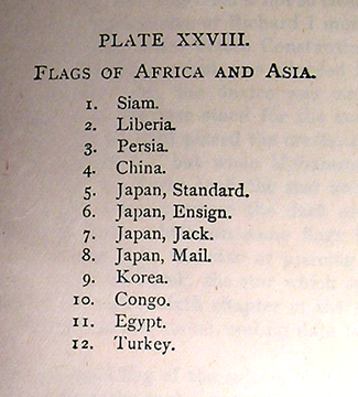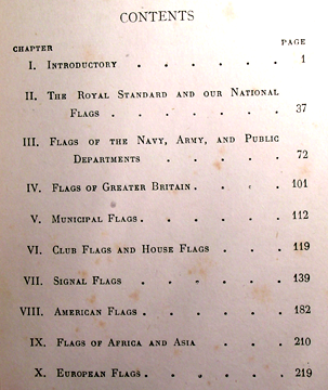 On the first page of the introduction, Hulme offers his perspective on the nature and function of heraldry:“"So soon as man passes from the lowest stage of barbarism the necessity for some special sign, distinguishing man from man, tribe from tribe, nation from nation, makes itself felt; and this prime necessity once met, around the symbol chosen spirit-stirring memories quickly gather that endear it, and make it the emblem of the power and dignity of those by whom it is borne... the distinctive Union Flag of Britain, the tricolor of France, the gold and scarlet bars of the flag of Spain, all alike appeal with irresistible force to the patriotism of those beneath their folds, and speak to them of the glories and greatness of the historic past, the duties of the present, and the hopes of the future..."” We have here several imperial motifs, such as the path from barbarism to civilization, the association of patriotism with emblems, etc. Although these observations do not immediately relate to our current task of identifying the flags, they could suggest a direction for a project examining, for instance, the social and political function of flags.