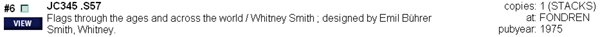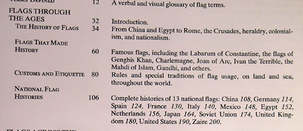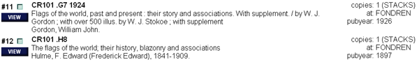 Getting an exact match for our flag will require a bit of browsing. Let's gather up several of these resources so that we can review their contents for the information we need in one sitting. Besides, you will notice the similarities in their call numbers. Remember that similar books are grouped together for their content. When you visit the stacks, you should always look around for other related material.