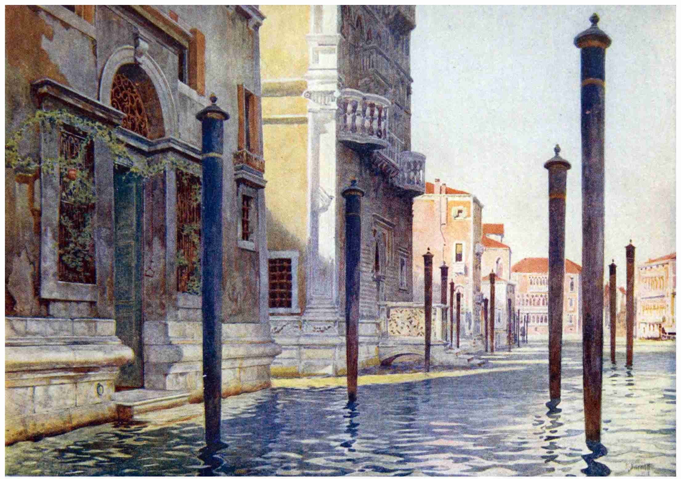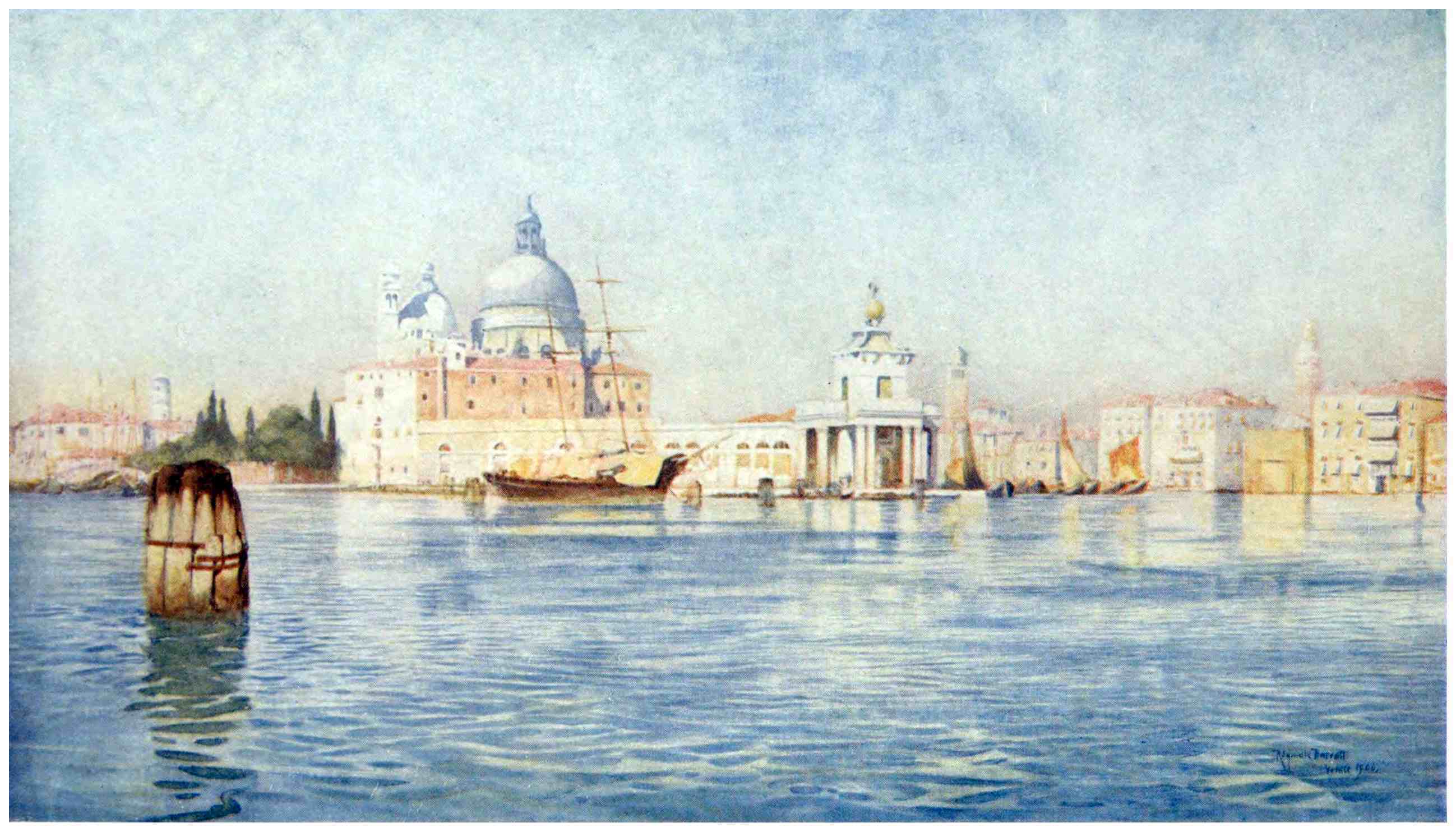 The Sacca della Misericordia has a majestic corner-stone in the Casa degli Spiriti, the long garden of which is joined to the island of the Abazia by the Ponte della Sacca, a beautiful bridge of pale rose stone bound and lined with white marble. To those who live overlooking the Sacca, the House of the Spirits becomes an inseparable part of the landscape of the lagoon. Modern incredulity has preferred to talk of smugglers instead of spirits, or to find in the weird echoes which inhabit the Sacca and the neighbouring waterways an explanation of its name. Others maintain that it owes it to the companies of wit and intellect that gathered there in the days of Titian and Aretino; no proofs, however, have been offered in support of this alluring suggestion. But if modernity has driven out the spirits, the house itself has become a ghost. In the midst of the thunderstorms which from time to time break over the lagoon the Casa degli Spiriti stands out a ghostly landmark, framed suddenly by a sickle of gold or flashing silver, or illuminated by a level flood of purple, a place of revel for the spirits of the storm. In the calm moonlight it appears more pallid than the moon herself; in the black starless night still the huge corner-stone looms out on the edge of the lagoon. And there is no watch-tower to equal the Casa degli Spiriti for the spectacle of dawn upon the mountains. Those who wake within Venice under a glimmering grey sky, with rifts of remote, transparent blue, hear talk of coming rain. But the House of Spirits which kept watch all night upon the north lagoon, has had its day already in one short hour of dawn. It has seen the Alps rise blue and clear behind the low green line of the mainland; it has seen the ruby fire drawn from them by the dawn; it has seen the crystal path of the lagoon fade to the dove’s neck with its waves of peacock green; it has seen the fishing-boats come pressing with their many-coloured sails against the sunrise, each, as it turned before the wind, sealed with a golden blessing from the god of day.